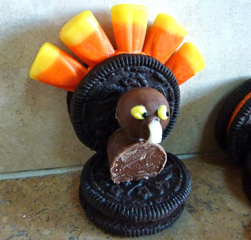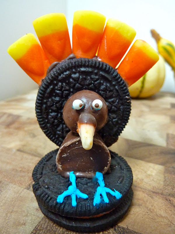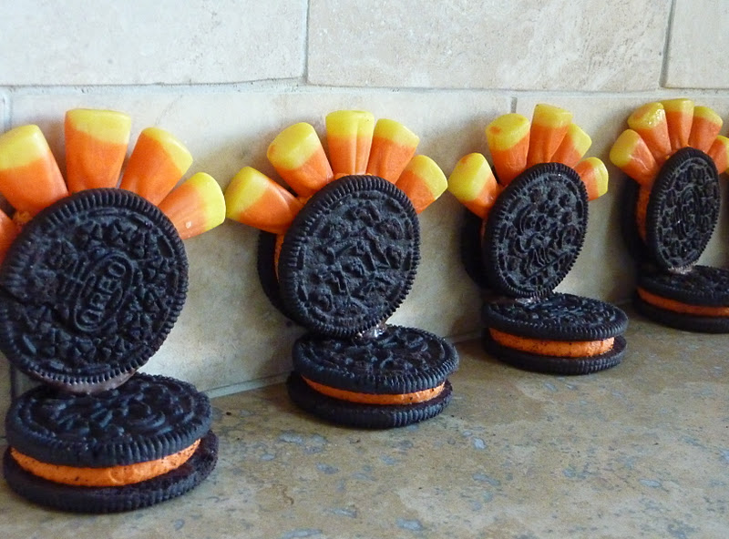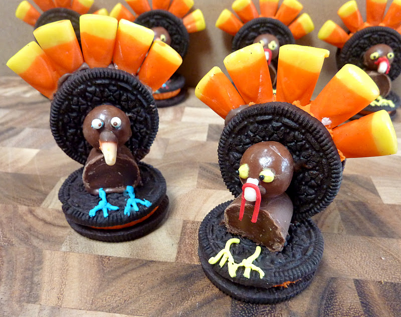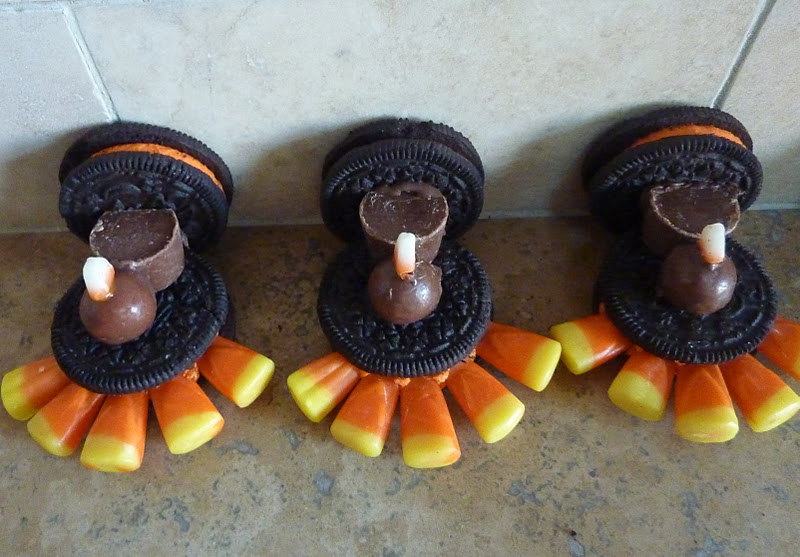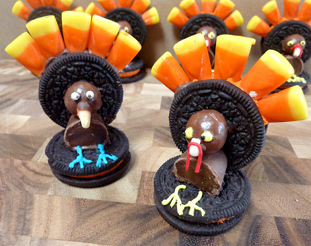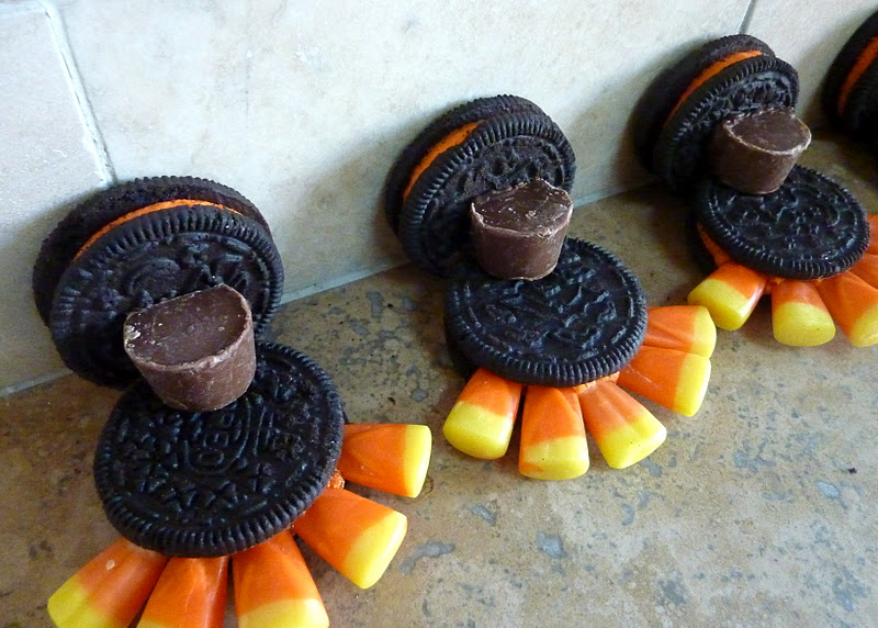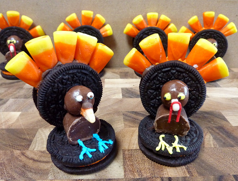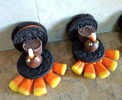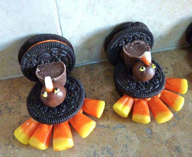 Aren't these the most adorable Thanksgiving treats? Don't they bring a smile when you see it? Turkey on the right is checking out turkey on the left's cold feet. (We ran out of yellow...)