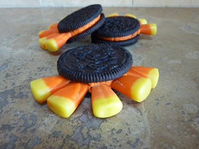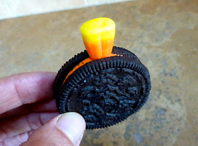 Insert candy corn into oreo cream center. You can use frosting to help keep the candy corn secure, but I found the oreos that had the cream almost spilling out on one side, so they snuggled in nicely.
