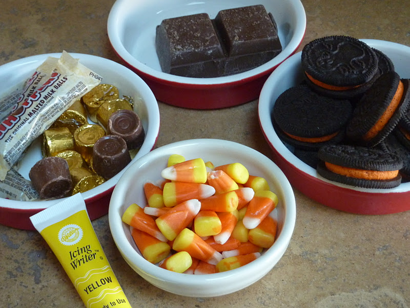 Oreo Cookies- I used Halloween ones with orange creme, if not available, go for the double stuff, as it holds the candy corn feathers better.